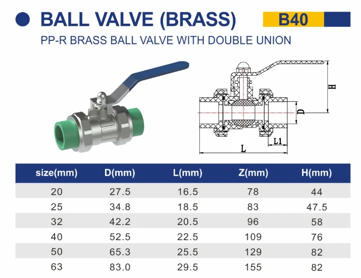 | Description | PP-R BRASS BALL VALVE WITH DOUBLE UNION |