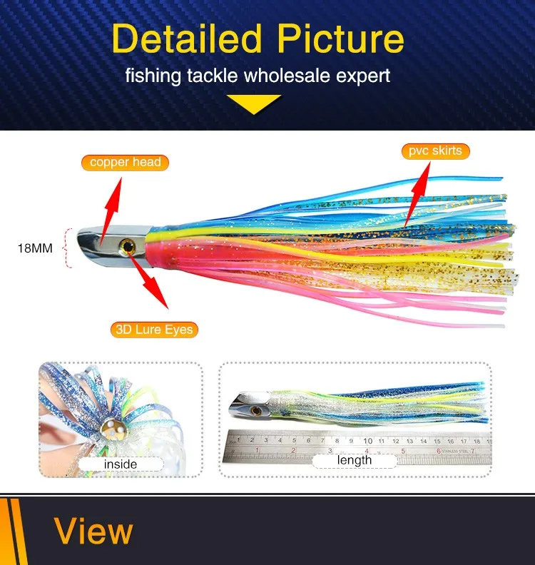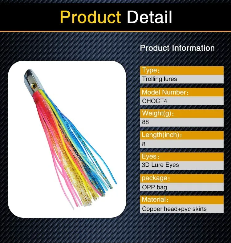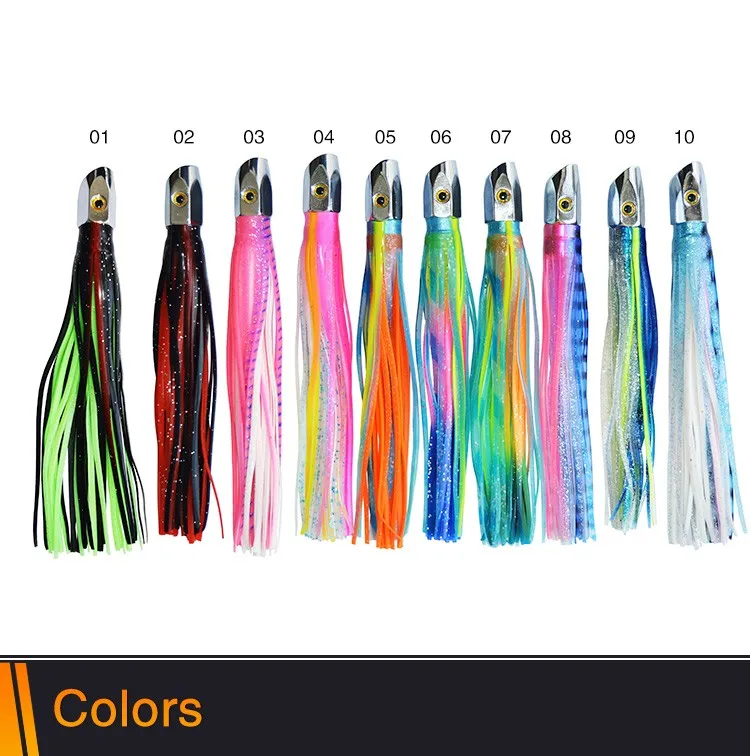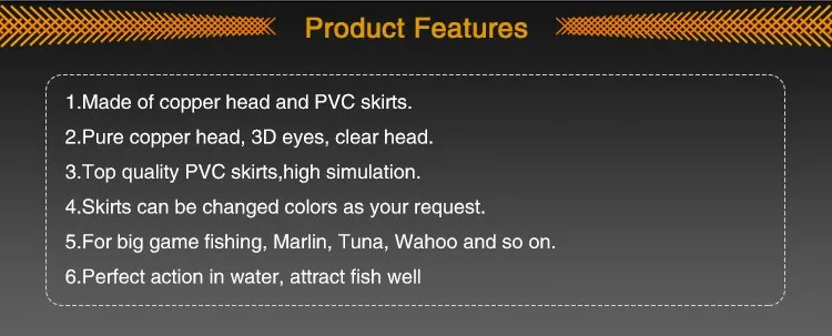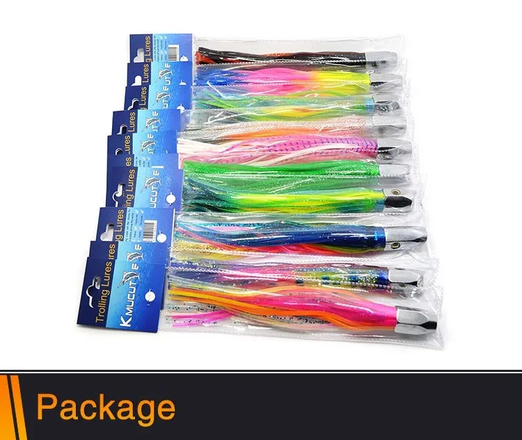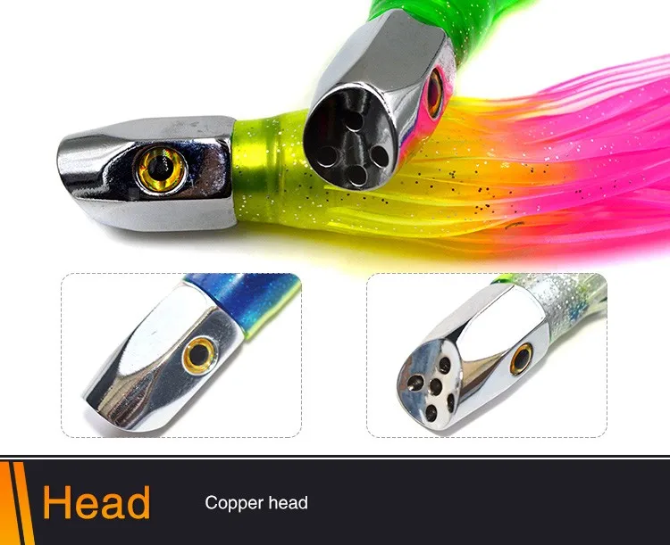 Feature | Turbo Jet Head 8" fishing lures. These premium offshore lures are heavy (3 oz.) to stay deep in the water and allow you to troll faster and cover more ground. With 5 jet holes in the head and a double skirt made of premium grade vinyl for durability, it will produce a large "smoke" trail of bubbles that attract fish. These lures are ideal for Wahoo, Tuna, and Billfish. |