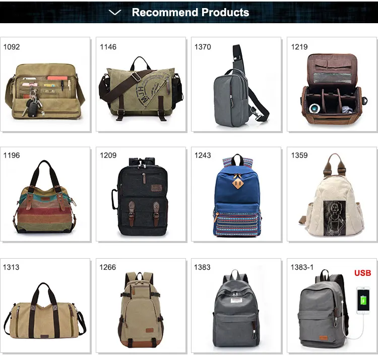 Bag Details: | 1.Size:40*16*27cm or Customized 2.Color:Black,blue,khaki or Customized 3.Material:Canvas 4.Lining:Polyster 5.Trim: Canvas 6.weight:0.85kg 7.Packaging Detail:No stuffing,1 pc into a poly bag and several pc into one carton based on the size of the bag/ Customized