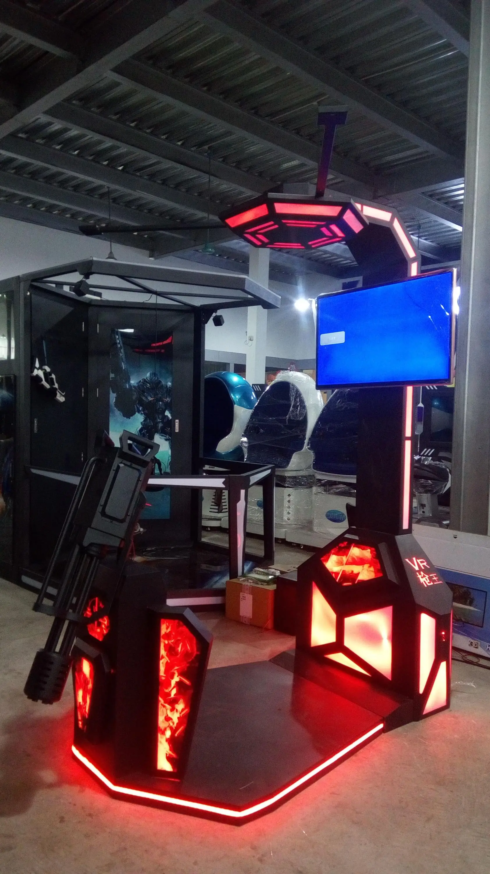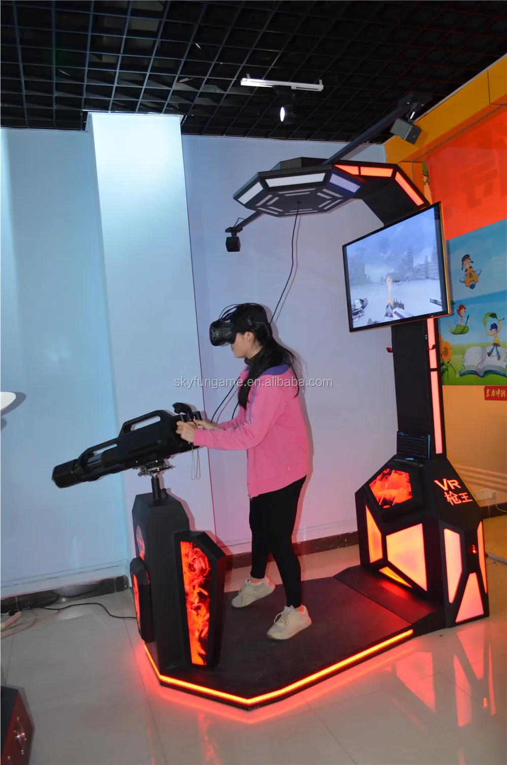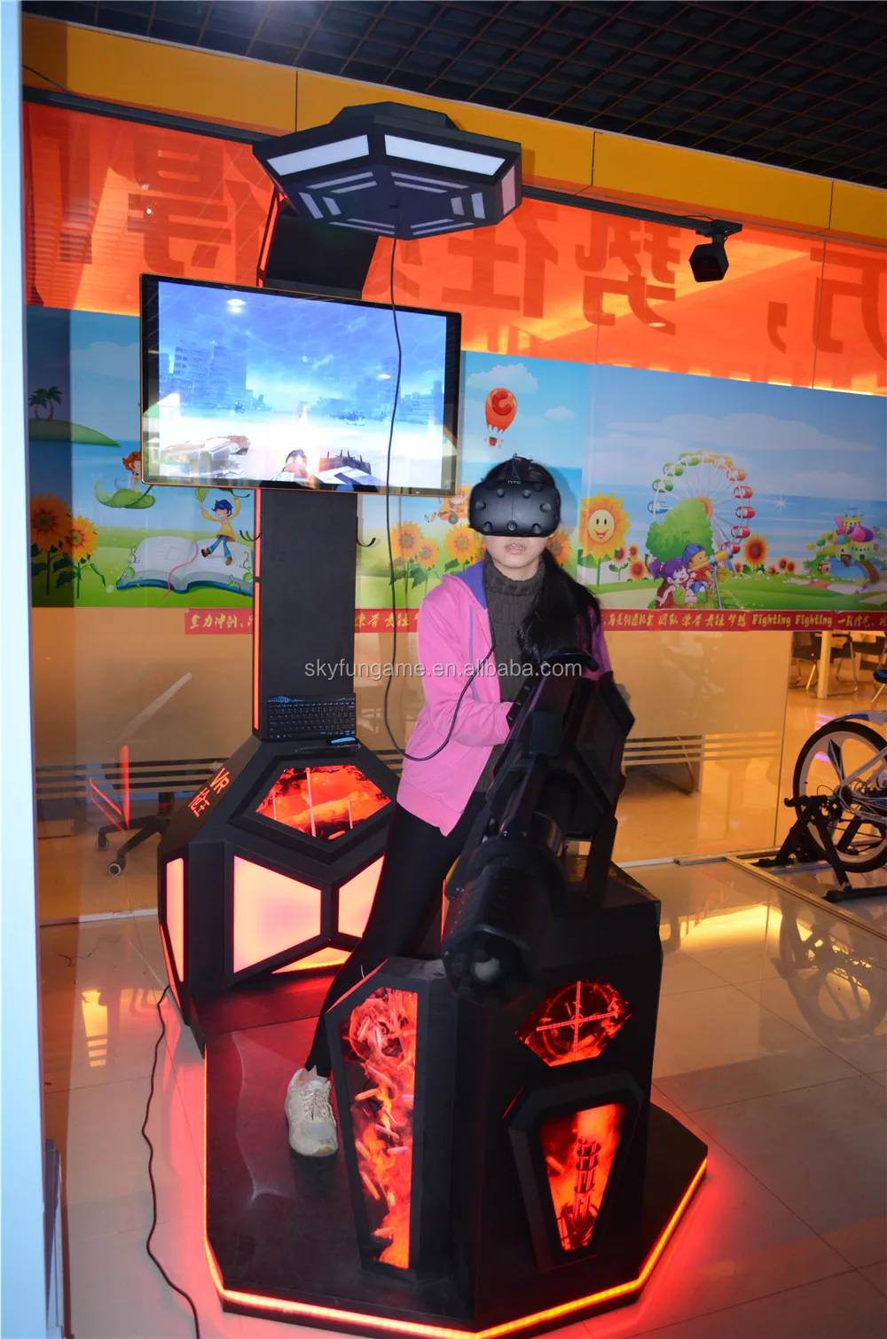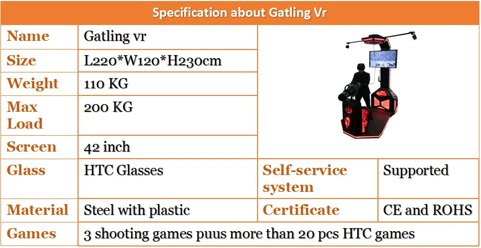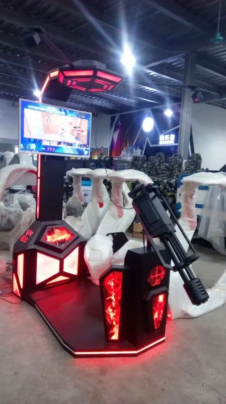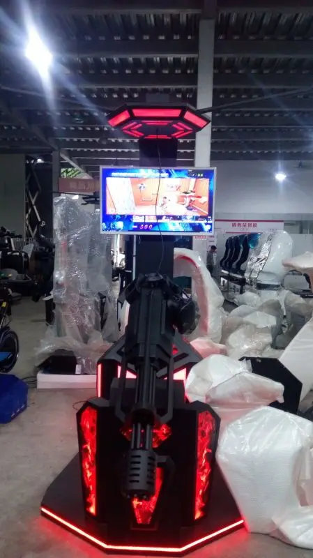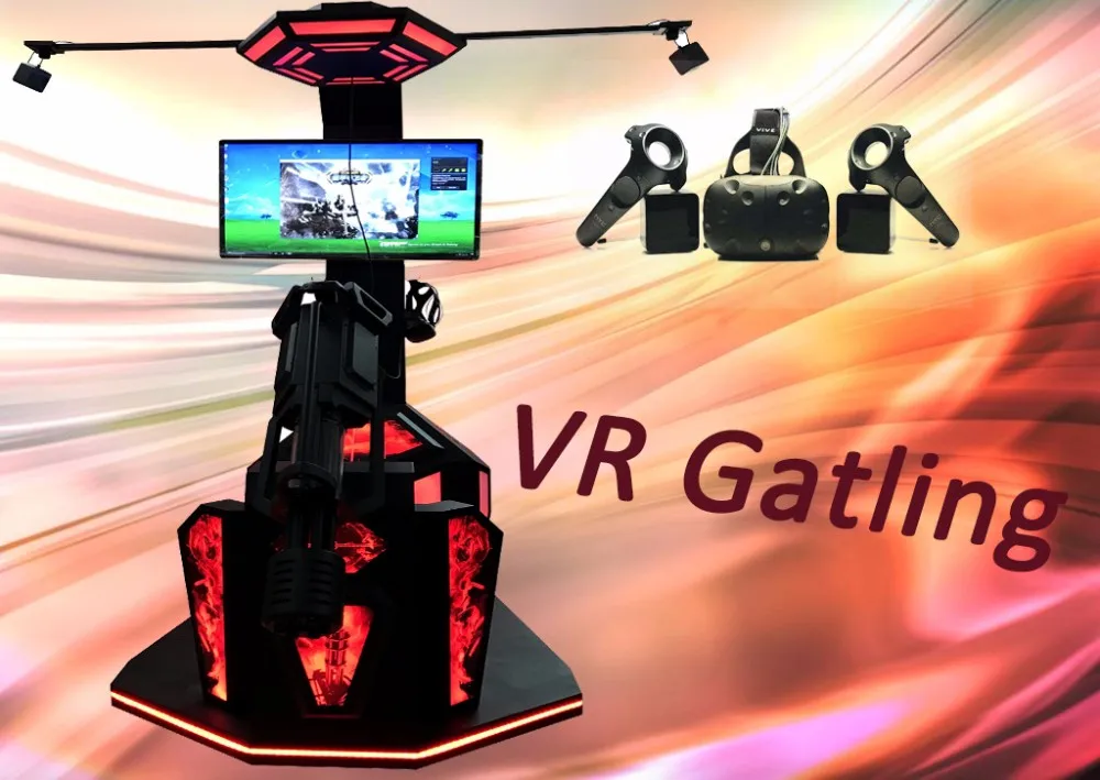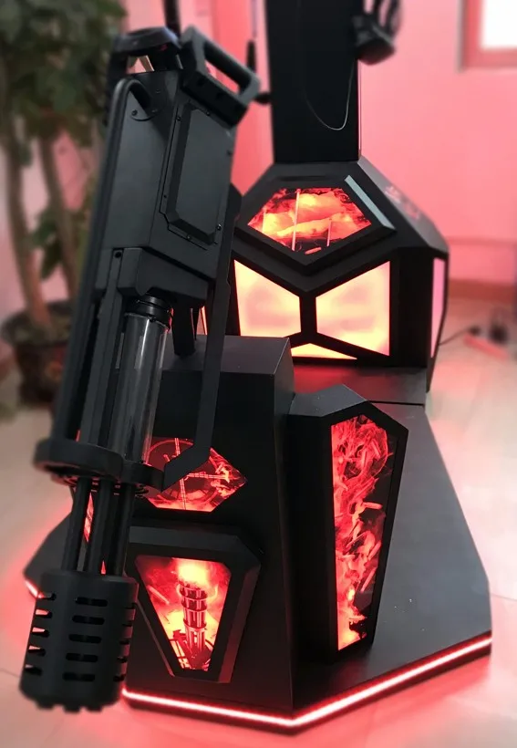 VR Gatling Fighting Simulator adopt the space location system, motion capture system of HTC VIVE, combine with VR glasses and 3D game closely, completely achieve the separation that the head unit control the game vision and the hand control the game instruments. The player can performance freely in the virtual space without body limitation. Fully immersive experience of gun shooting, the users can get thrilling and exciting.