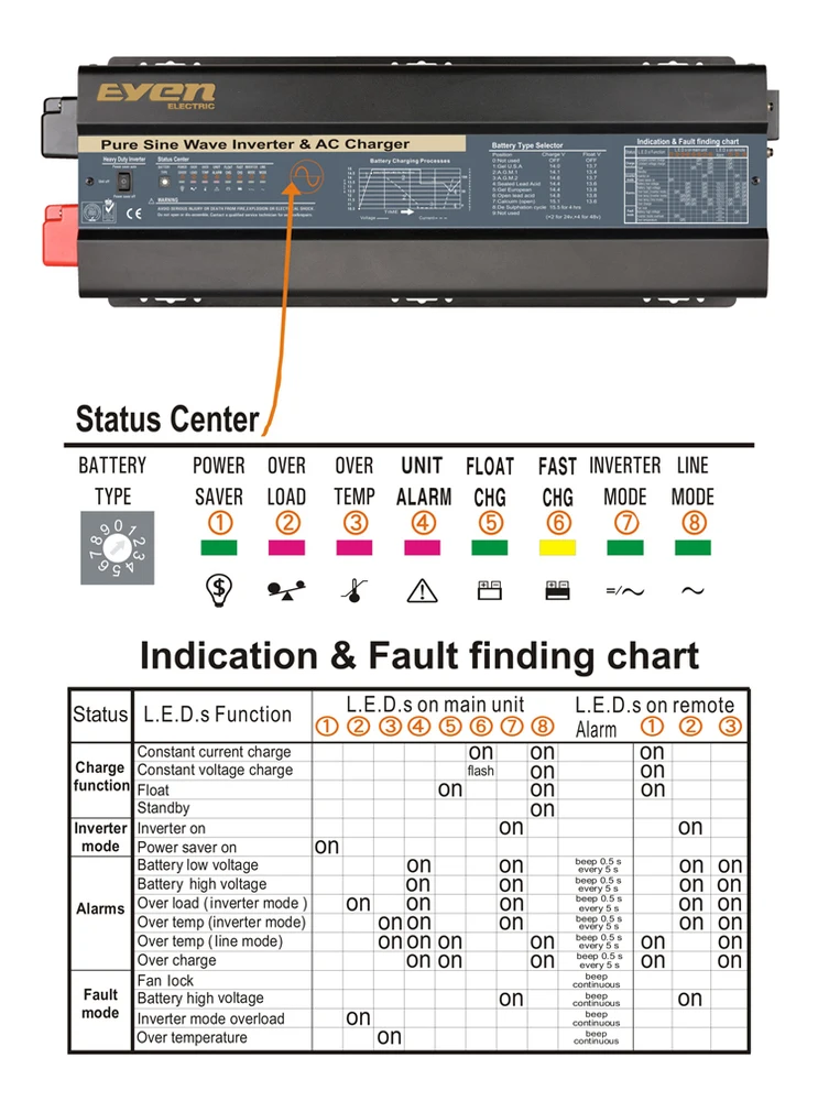 | Charger curve(4 stage constant current) 4 step digital controlled progressive charge | Battery types ( *2 for 24Vdc, *4 for 48Vdc) | |||||||