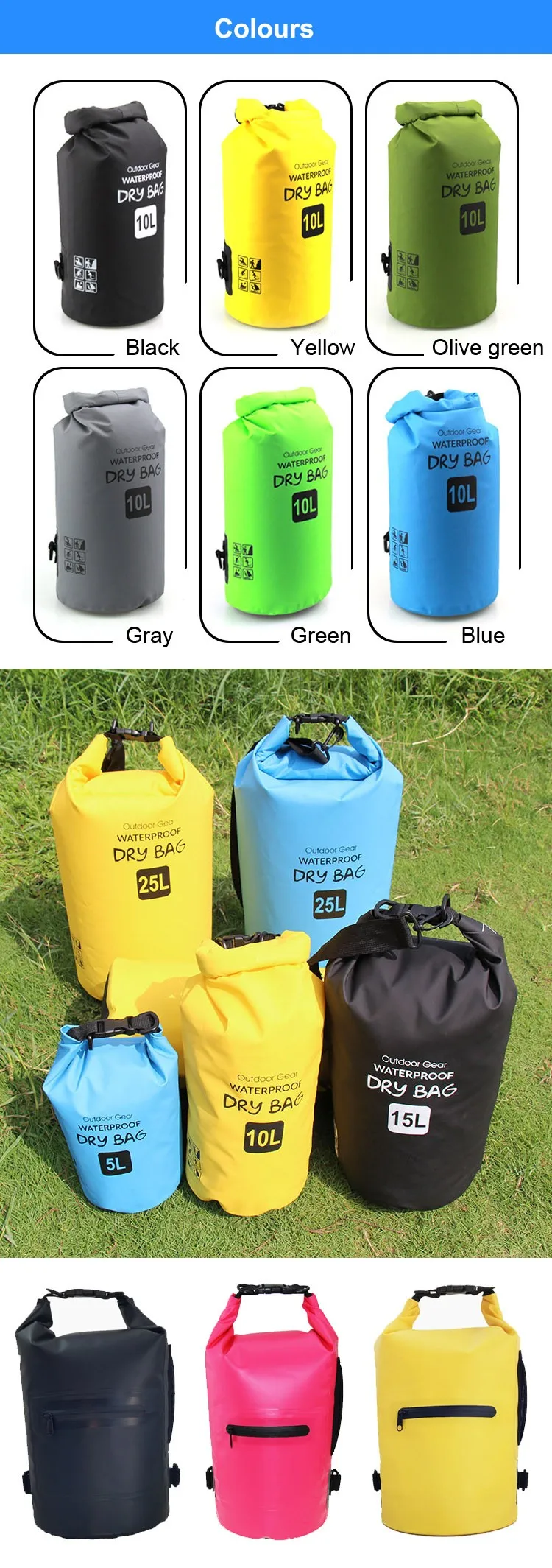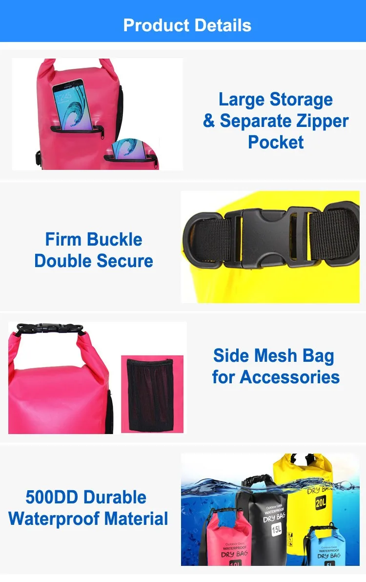 Product Name | New Design Zipper Pocket Roll Top Custom Logo 100% Waterproof 2L 5L 10L Dry Bag for Camping Fishing Swimming | ||||