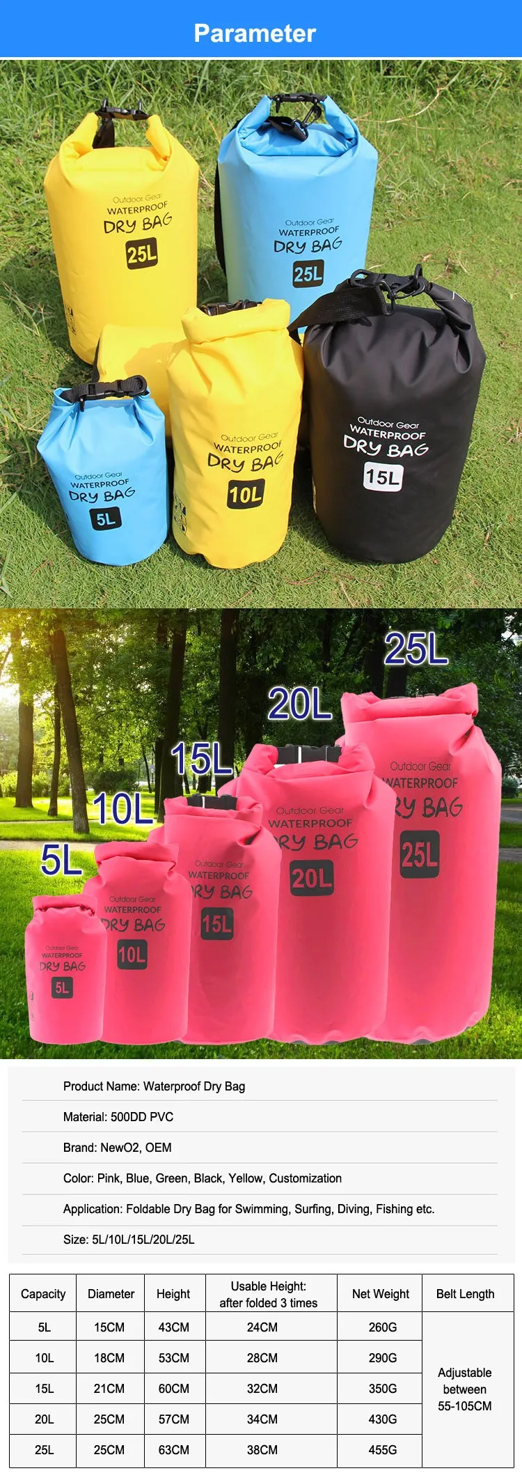 Application | Dry Bag for Swimming, Fishing, Travelling, Hiking and Camping etc | ||||