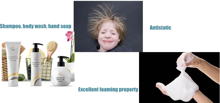 Widely used in the preparation of medium and high quality shampoo, body wash, hand soap, foam cleanser and household detergent; Is the preparation of mild infant shampoo, baby The main ingredients of baby foam bath and baby skin care products; It is an excellent soft conditioner in hair care and skin care formulations. Also can be used as detergent, wetting agent, thickening agent, antistatic agent and fungicide, etc.