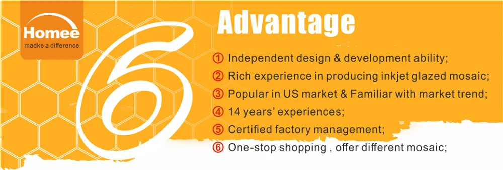 Q1. Do you have a minimum order quantity? A1: Yes, we do. We keep no stock or very little stock for the products we promote. We do have a M.O.Q requirement to start production. This M.O.Q varies by the technics and machines. Normally, it is around 1 pallet or half pallet load per item. Please feel free to contact us and we will check detail for you. Q2. Do you have dealers in my area? A2: Homee is a major OEM mosaic tile supplier in China for many different tile brands from around the world. We did not focus on markting our own brand products in the world. There may be an importer in your country already carries the same product as you seen on our website with their name brand name. Please feel free to let us know your location and we can check for you. Q3. What is your return policy? A3: Orders cannot be cancelled and returned unless for quality problem reasons. Q4. What is your quality and quality assurance? A4: Homee products are manufactured in compliance with the strict quality standards in the industry. In other words, we keep a top quality level in the industry. Please feel free to ask us for samples or visit our factory to check our product quality.We are committed to continously improve our product quality and responsible for any quality problems. We provide free replacement or refund for any shipments with quality problems. Q5. What is your lead time? A5: From 2 weeks to 8 weeks, it varies by the quantities of your order. Normally, one 20' feet container order are shipped within 4 weeks. Q6. What are the shipping methods of samples? A6: Samples are usually shipped by 4 international courier companies. They are: Fedex, DHL, UPS, TNT. If you already have an account with one the above companies, you may ask them to arrange a pick up at our office. Or let us know your account number and we could do this for you. Q7. Can you send me samples? Are they free? A7: Yes, we'd love to. They are free of charge unless you need big quantity samples for distributing to your dealers or customers. However, we don't provide free shipping. The international shipping cost will be borne at your side. |