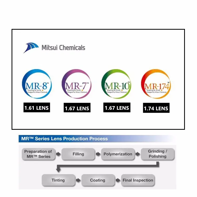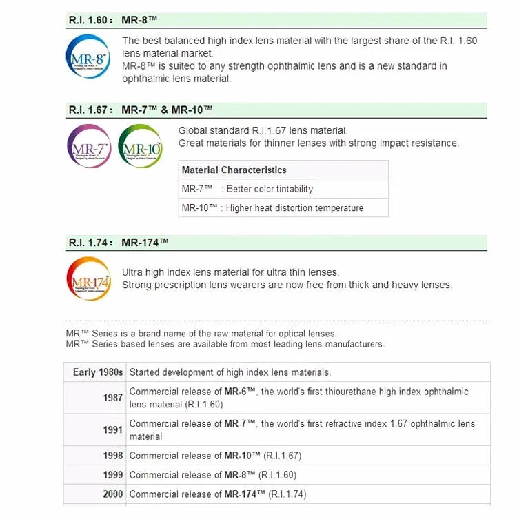 * Optical Lenses for 1.499 , 1.56 , 1.59 , 1.61 , 1.67 , 1.74 , 1.523 , 1.70 , 1.80 and 1.90 .