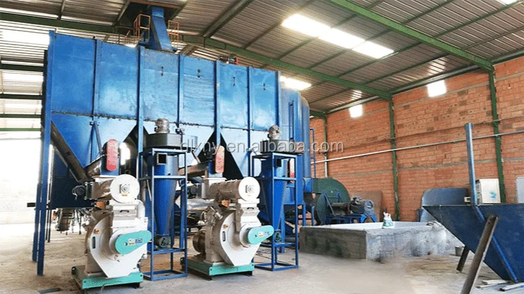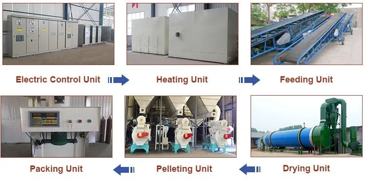 Complete Biomss Pellet Production Line consists of heater, feeding machine, rotary drum, discharging machine, induced draft fan, unloading feeder, cyclone, odor removal equipment and power distribution cabinet.