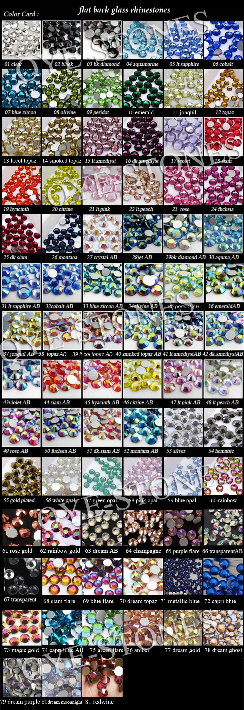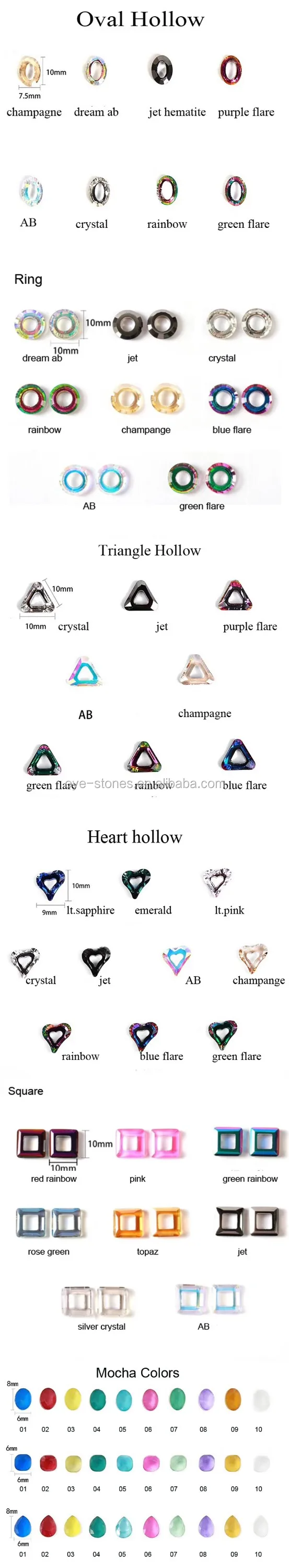 | \t COLOR | \t crystal,crystal AB, sapphire, lt.sapphire,lavender, pink, jet lack, sapphire,emearld, aquamarine,montana,purple, tanzanite, dk. sapphire, lt.peach, siam , gold champange, tea,gold,citrine,olivine,peridot, bk.diamond, smoked topaz, blue zircon, rainbow, lt.siam, amber, hematite, lt.col.topaz,purple flare, blue flare, green flare, gold, dream ab, red ab