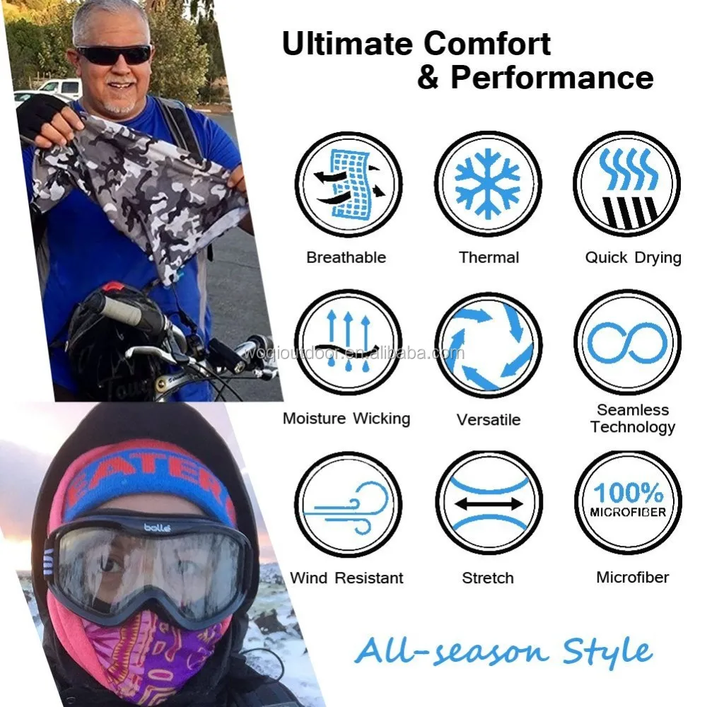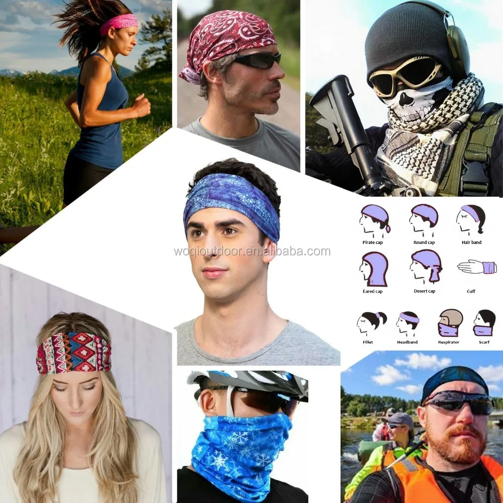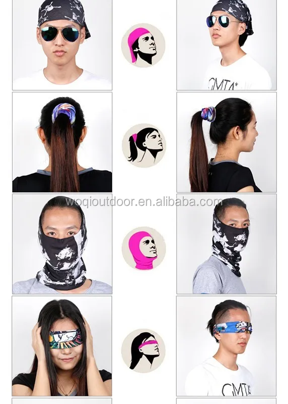 Multi functions,can be used as balaclava, headband, face mask, neck warmer, yoga wear, foulard, hairband, scrunchie, neck gaiter, wristband, cap, do rag, hood, neckchief, pirate bandana, sahariane, sunguard for cycling, skying, hiking, climbing, yoga, running, riding and many more