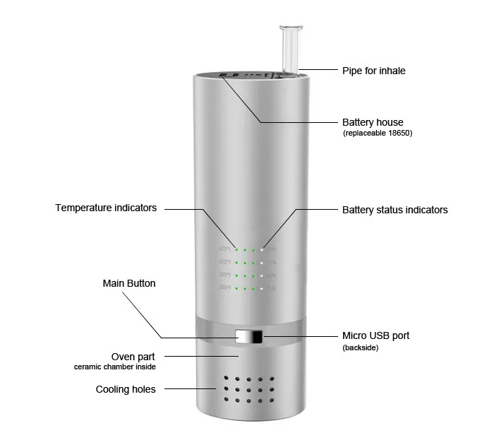 1.In shutdown mode, press button 5 times in 3 seconds, device turns on, white LED indicates power, red LED indicates the level and heating state. Press 5 times in 3 seconds to turn off, White and red LEDs are both off;