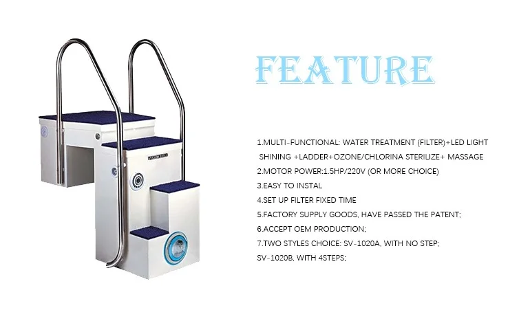 1.Multi-functional: water treatment (filter)+LED light shining +ladder+ozone/chlorina