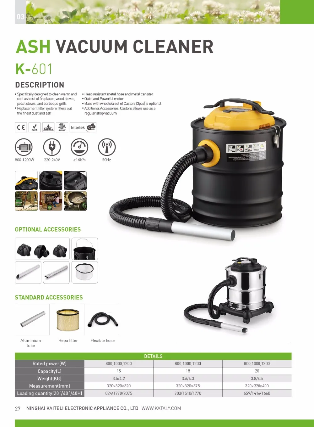 *NEW MODEL, with filter Self-cleaning *Specially designed to clean cool ash out of fireplaces, wood stoves, pellet stoves, and BBQ grills. *Replacement filter system filters out the finest dust and ash. *Heat-resistant metal hose and metal tank. *Air blowing function *Dust full indicator *Filter self cleaning function, to keep the filter unclog, easily to suck the ash till tank full. Rated voltage:230v~50Hz Vacuity:≥16kpa Noise level:≤79dB(A) 1pc HEPA filter 1pc Fire-resist hosepips 1pc Alu tube 1pc 1.5m power cable with VDE plug CE/GS/ROHS/EMC