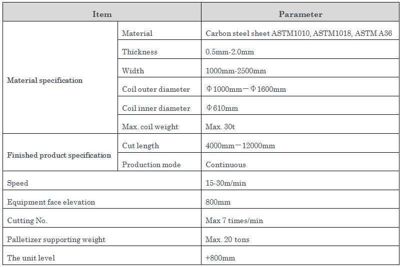 Prepearing coil→loading car → uncoiling →centering →Pinching and leveling→ transmission table→ vertical roller→ measuring length and Leveling →Cutting to fixed length → transimission roller table → fine leveling →transimission roller table→pinching rollers→palletizer