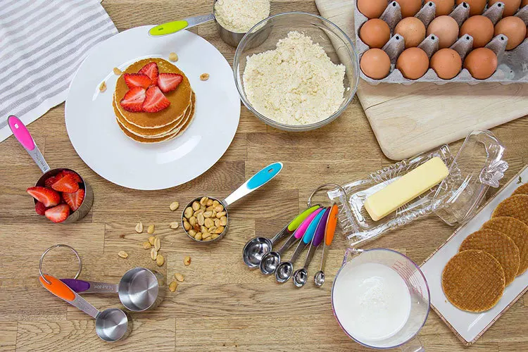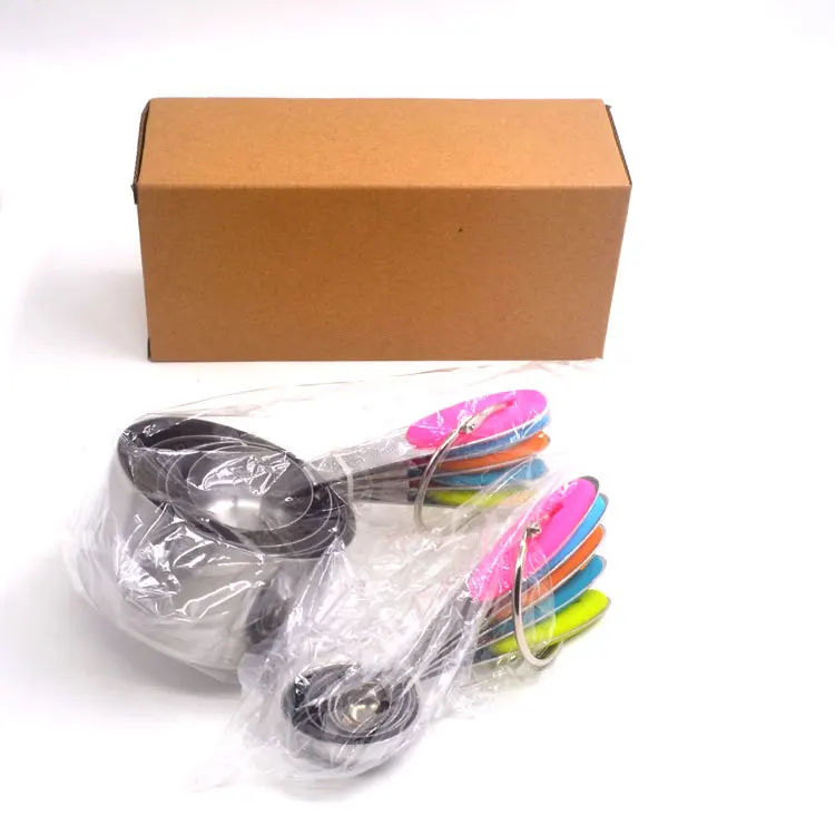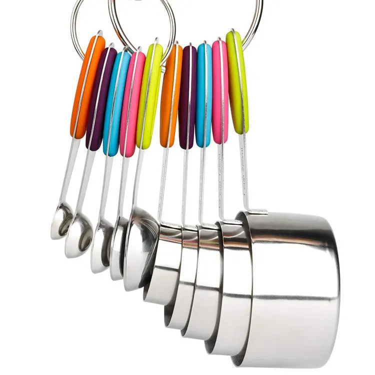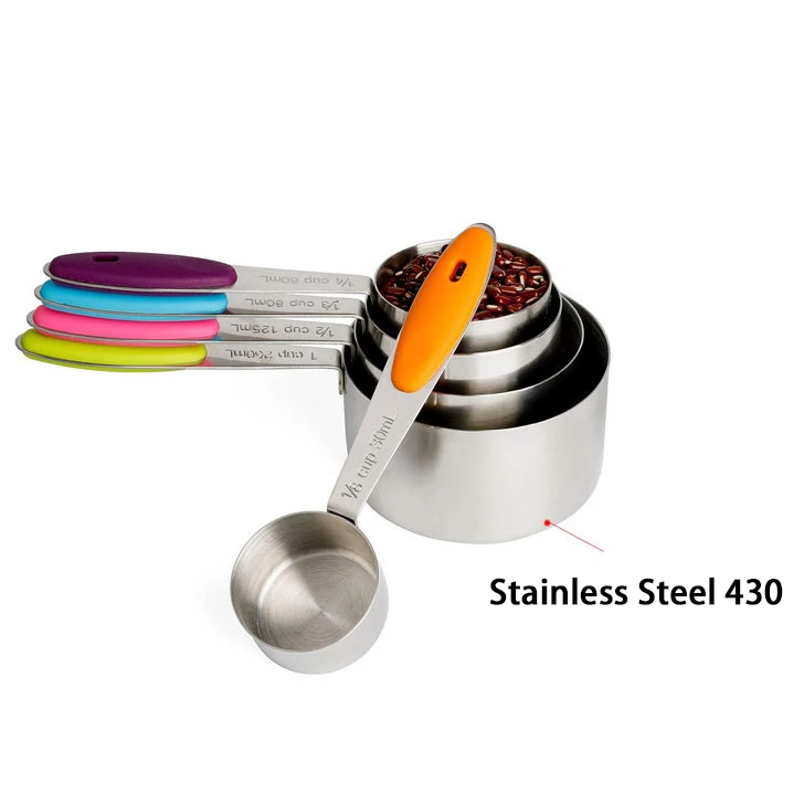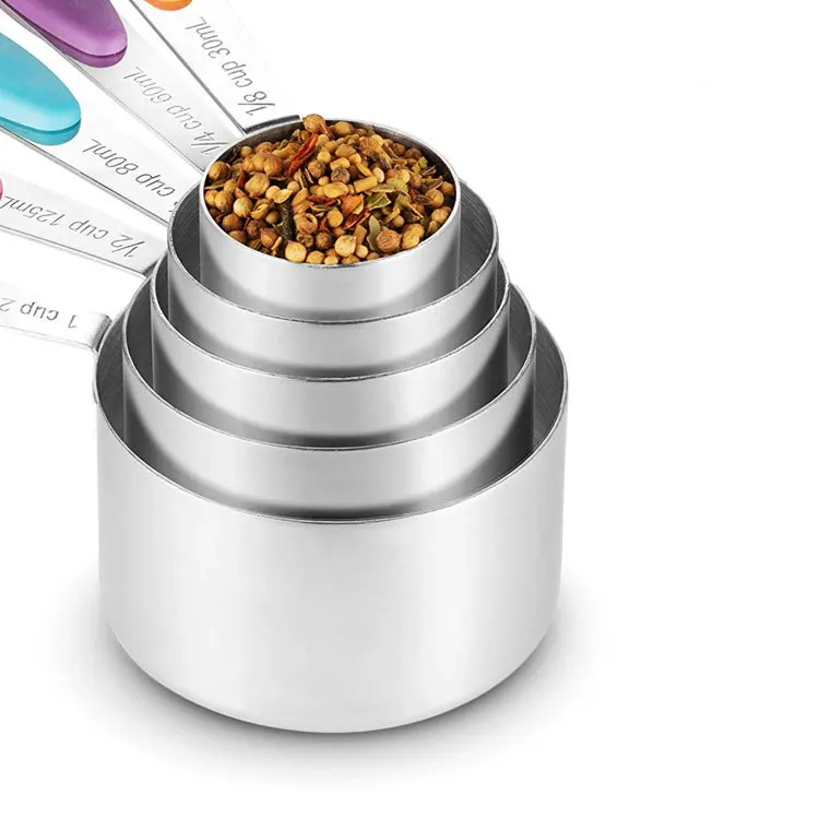 * COMPLETE SET OF 10: Includes 1/8 cup, 1/4 cup, 1/3 cup, 1/2 cup, 1 cup & 1/4 tsp, 1/2 tsp, 1 tsp, 1/2 tbsp, 1 tbsp, totally 10 sizes to meet all you needs. * NO MORE GUESSWORK: Each cup's "ml" and cup sizes have passed clearly engraved marking, and you can quickly identify the cup scale according to the color of the handle. No more guess in kitchen! * COOK SAFELY WITH 18/0 STEEL: We know that, you are worry about BPA-infested plastic. Don't worry, all of our product is crafted from food grade 430 steel, they will not be polluted or eroded, make your cooking always safe and health. * SPECIAL DESIGN FOR USE BETTER: 18/0 steel material keep it sturdy without break case, high quality steel make it dishwasher-safe, conveniently nests inside one another design allowing you to store them in any drawer. Convenience your life.