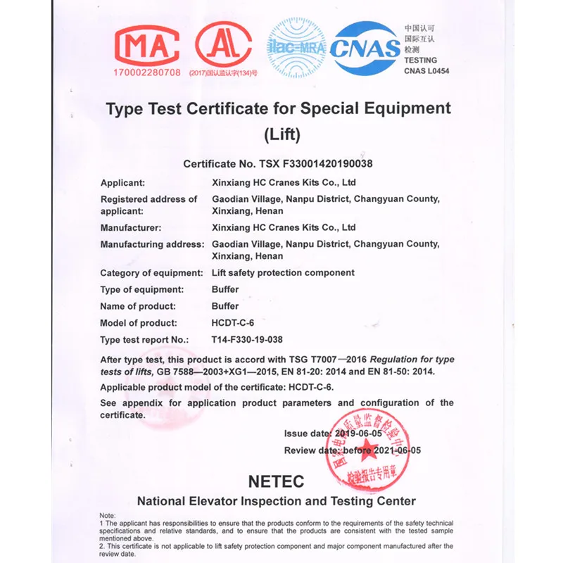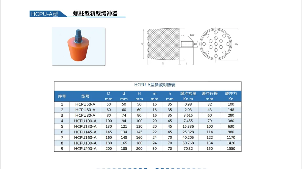 We ,XINXIANG HC CRANES KITS CO.,LTD , as a leading and professional manufacturer of Polyurethane Buffers in China , has been specialized in an extensive range of crane & trolley buffers , industrial buffers in various formats over 12 year . Equipped with two advanced producing lines ,we can produce customer specific solutions from our existing tooling, in different material and metal finish options. Please contact us if you require further information on our Stop Buffer range or alternatively with regard to any of our other product ranges.