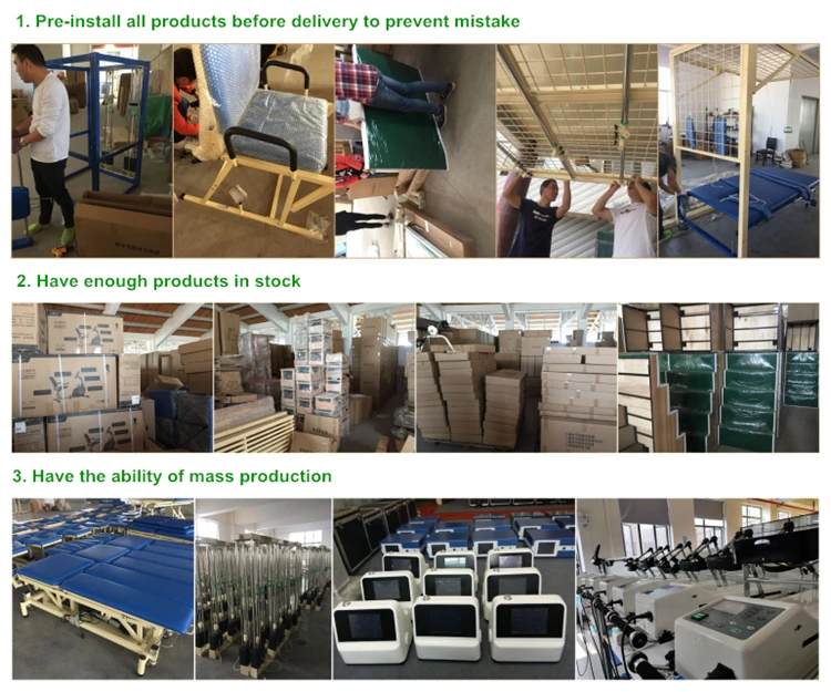 1.Are you a factory or trading company? * Professional supplier of rehabilitation equipments; * Lowest factory price with good quality; * Low MOQ for start small business; * Provide sample to check quality; * Meet safety standard for Europe and other area; * Accept trade assurance order to protect buyer 2.Can you do ODM and OEM? * Yes,we do. 3.What is sample time and production time? * Existing sample 2days; * Customized sample 5-7days; * Production time 15-20days. 4.How to ship? * Sea freight,Air freight,express; * Cheapest way is sea freight. 5.How to place a order? * Place order with saler; * Make deposit payment; * Start mass production; * Update the state and informations of mass production for customers; * Mass productions are finished,inform customers to make the balance payment; * Delivery. 6.How to find service department? * Have any questions,please send us details and photoes to our service department; * Call us directly.