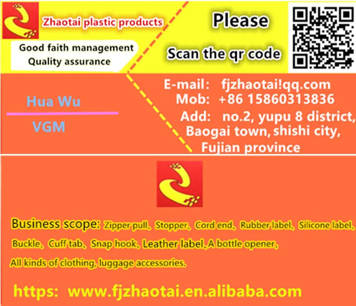 Shishi city zhaotai plastic products co.,LTD.Specializes in supply injection molding pull head ,rope buckle,cord lock,stopper,cord end,sleeve tab,drop plastic mark,hand handle and other luggage,clothing accessories products.The raw materials are mainly PVC and PU.It’s one of the standard accessories on the backpack.It is used for the adjustment of the weaving belt,the anti-slip resistance is strong,the modeling is simple,the feeling is excellent.The company’s integrity,strength and product quality are recognized by the industry.Welcome friends to visit,guidance and business negotiations.