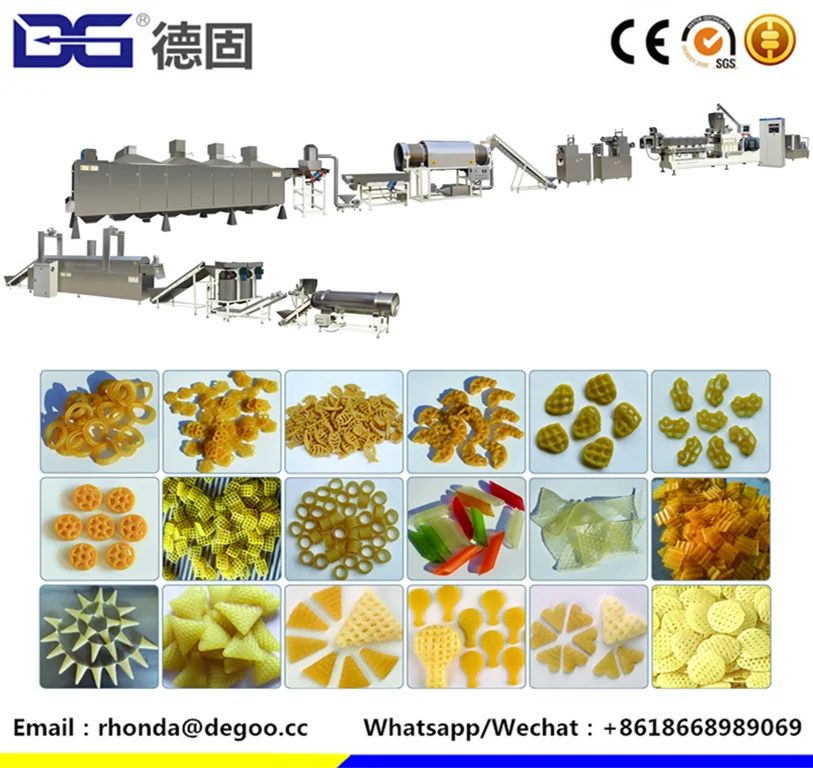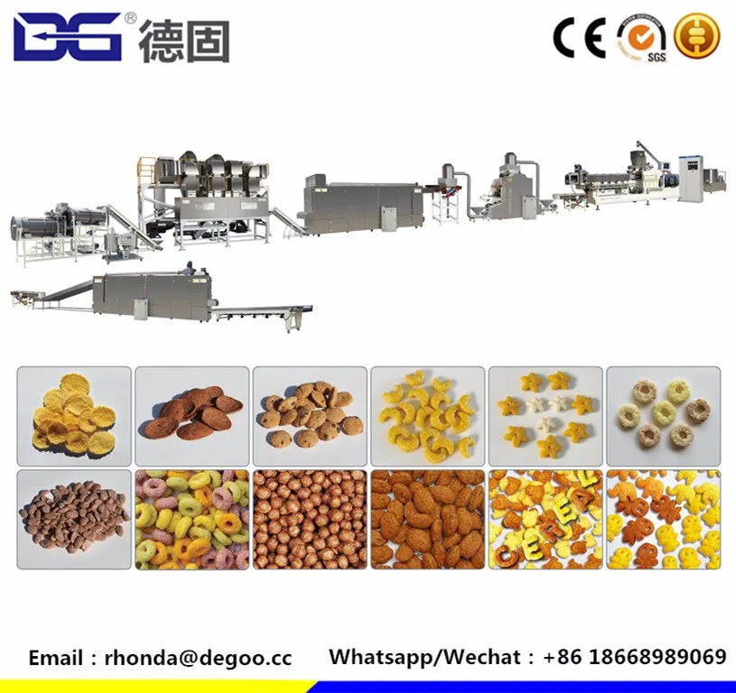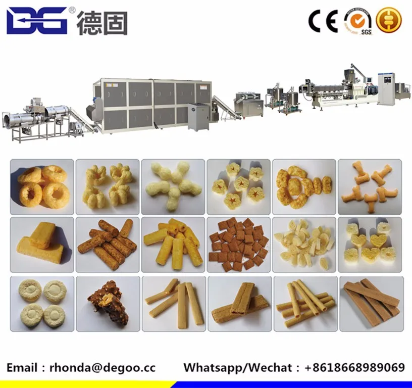 12. Applied to make all kinds of extrusion products such as corn flakes , cereal snacks ,puff snacks ,wheaten snacks , 2d /3d snack pellets , pet food ,fish feed ,soya protein ,nutritiobal powder ,modified starch and so on. .