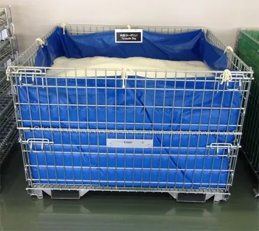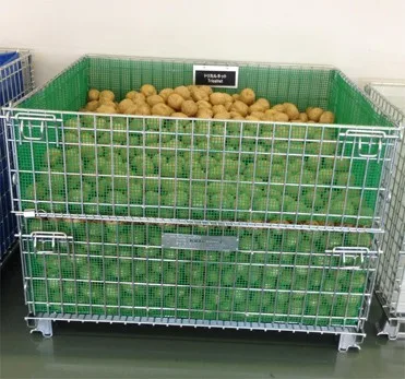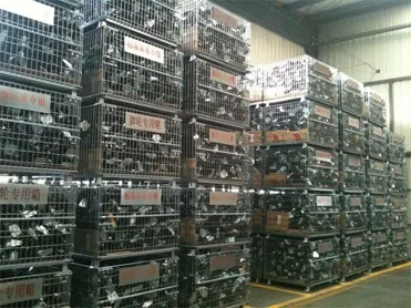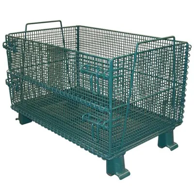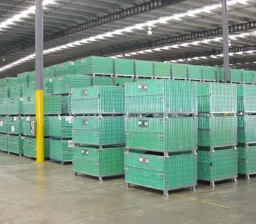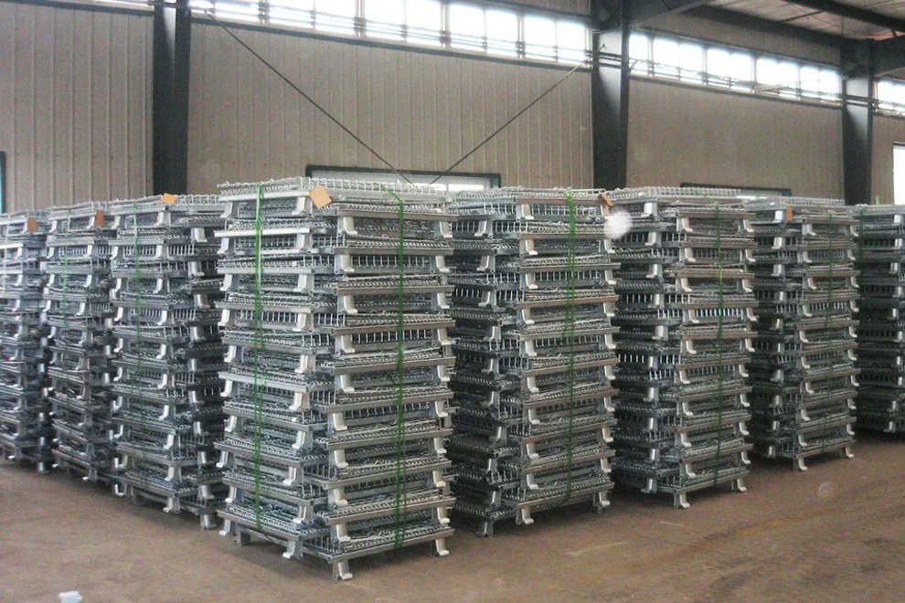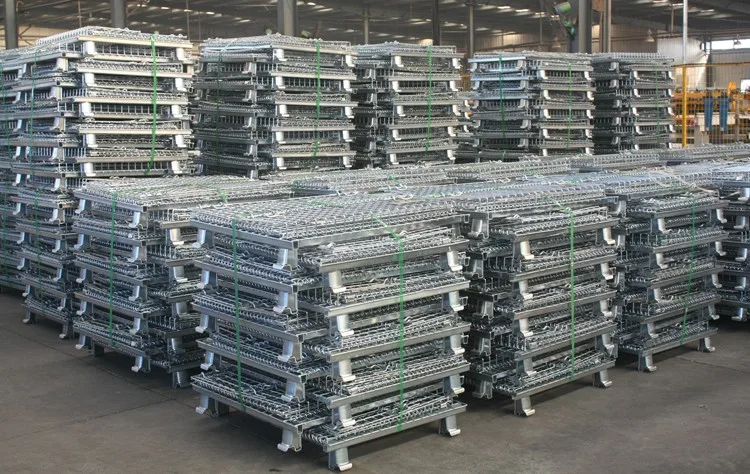 In order to prevent damage, we pack our wire containers in half skid, then stack 2 half skids together and bundle by plastic straps.