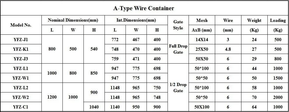 A-Type Wire Container Stock Size List