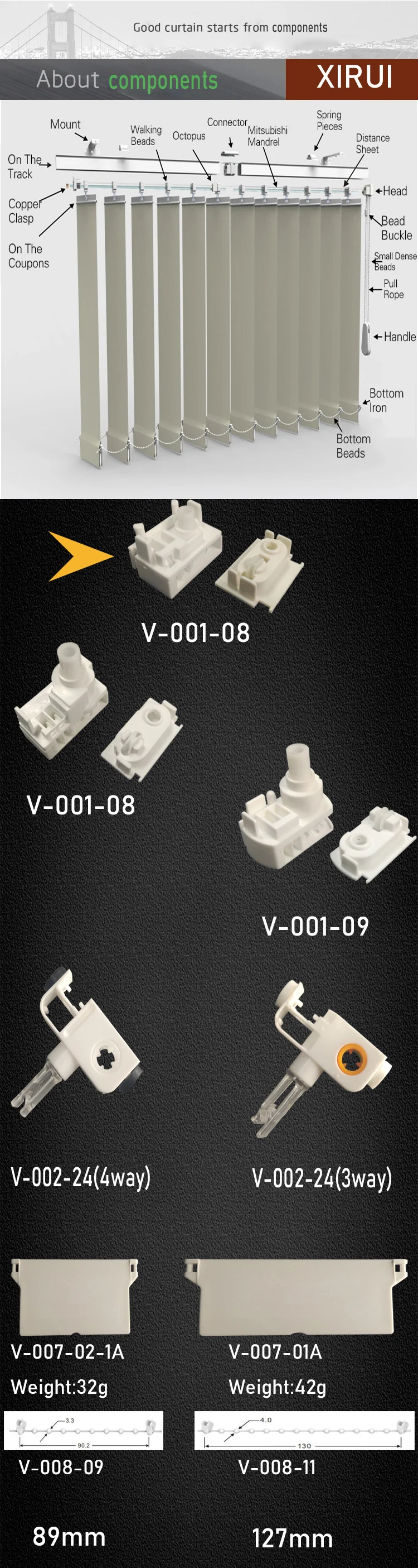 What we can offer | Accessories for drapery series: tracks, clutch, beads, top hangers, eight claws, bottom weight, distance pieces, bottom beads |