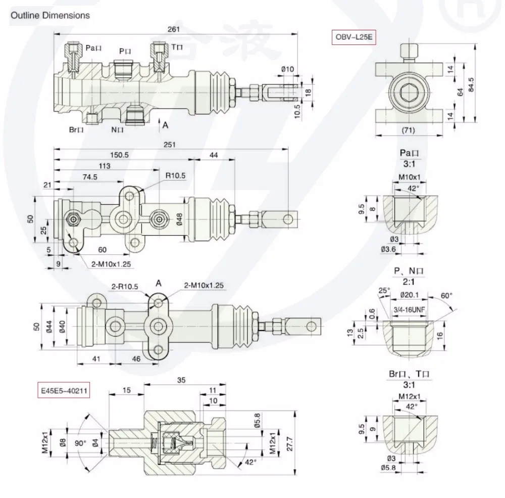 The combination between power brake valve OBV-L25E and accumulator HXQ can meet the braking function of forklift truck in driving, parking and emergency stop and very reliable, widely applied to the hydraulic brake system of forklift truck and the other material handling equipment.Combined with power brake valve, the relief valve E45E5-40211 can make the oil not fully return when unloading, to ensure that the filling is quick and brake is more reliable when re-braking.