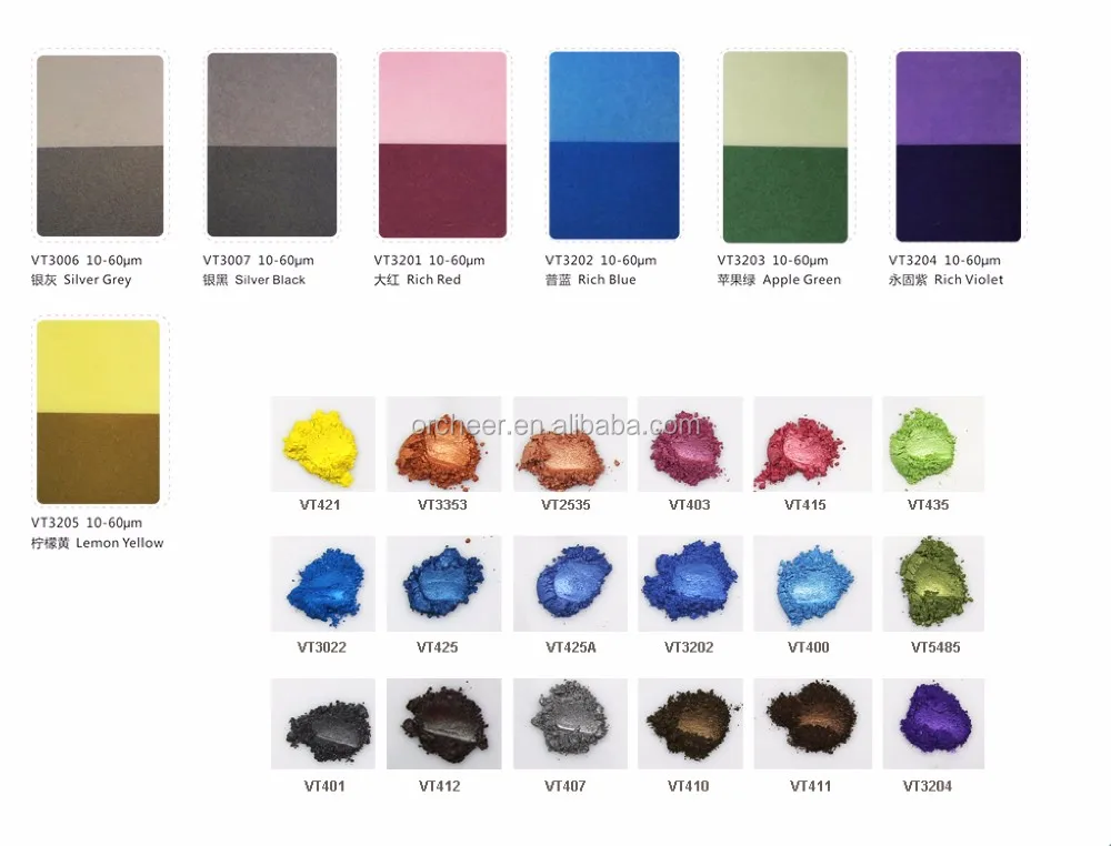 natural mica + titanium dioxide + organic color pigments. It presents different colors because of being covering different organic color pigments.