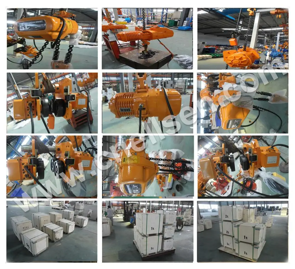 | General description | Electric chain hoist is a small light lifting equipment,widely usedto lift, loading and unloading, repair equipment, hoisting goods, install on a suspended I-steel, curve track, jib crane rail and fixed lifting hoisting heavy weights. Electric chain hoist can be classified into electric chain hoist with electric trolley,electric chain hosit with manual trolley,suspend hook electric chain hoist,low headroom electric chain hoist |