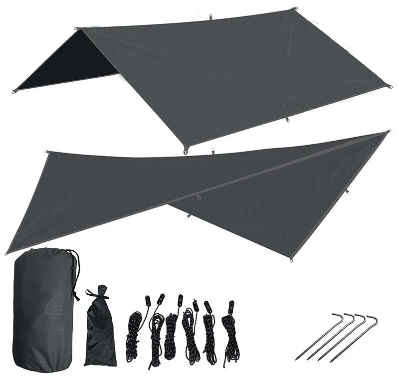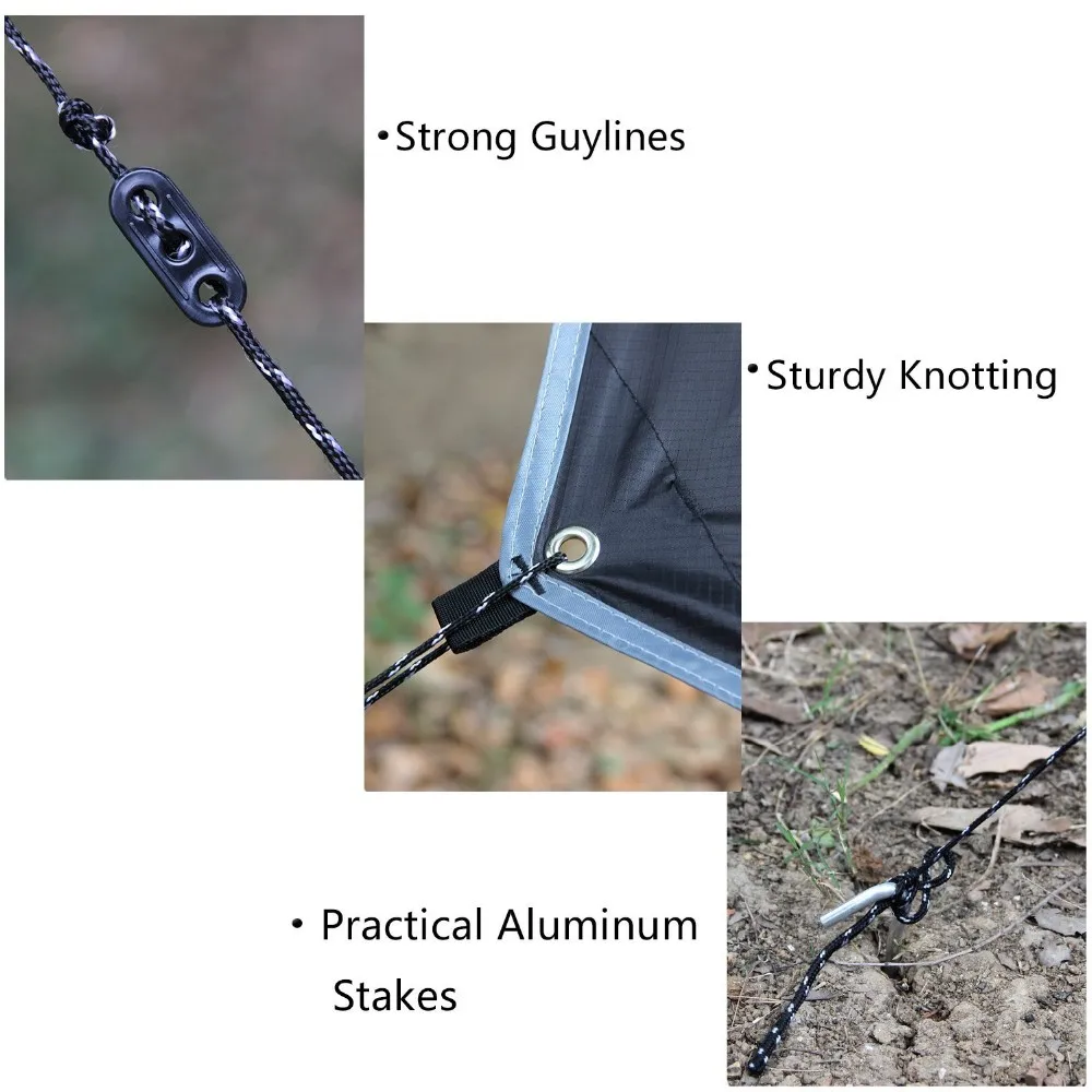 The tent tarp is versatile and durable, making it an excellent shelter for your hammock or shelter equipment, clothes, your remote kitchen or your dog.Ideal for camping,backpacking,sporting events,festivals,picnic and beach.