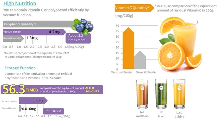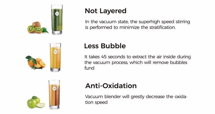 Vacuum Blender is a new concept blender, it differs with commen blenders or slow juicer. Its working theory is to take out the air before blending, that's progress named vacuuming, Vacuum make food cell enlarge for easy mixture.Vauum juice is rich in abundant nutrition, because it can extract 3 more times Vitamin and polyphenol, better for health...