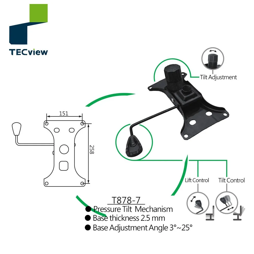 Conventional mechanism with one lever control for lock and seat height adjustment.Plate thickness is 2.5mm, It's base angle is 3°~25°.