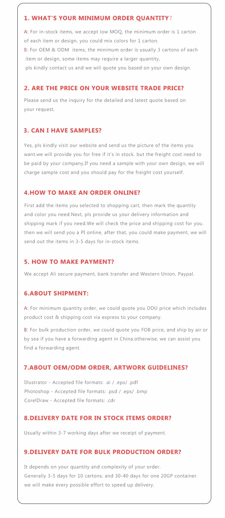 Delivery Time: 7-10 Days, suit for small quantity and in stock order.