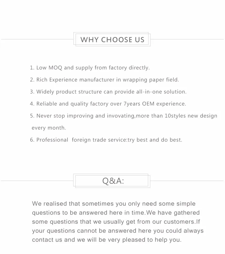 Our core competencies is wrapping paper, plastic film, satin ribbon, pull bow, gift box , Non-woven paper and so on.