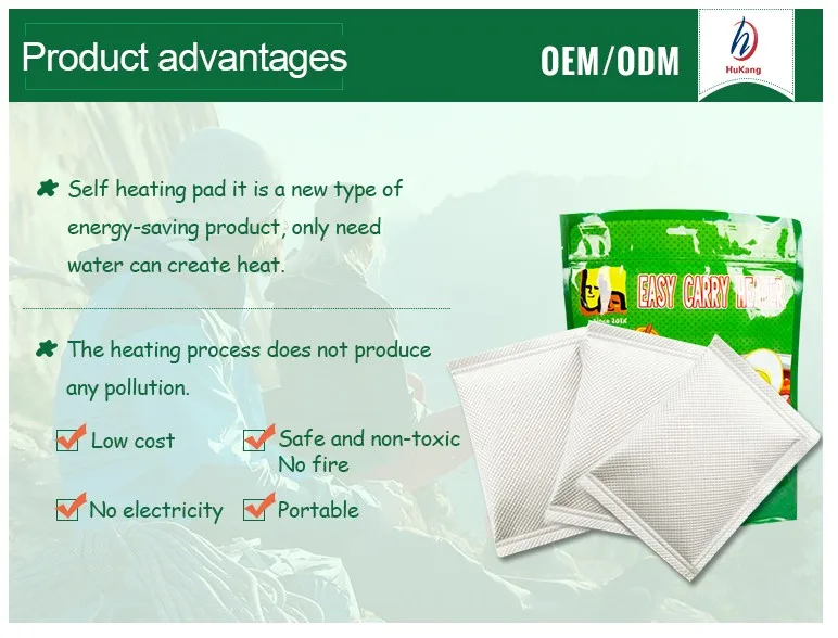 Feature | 1.Water Reactive MRE Heater 2.No need fire and electricity 3.Disposable after use and environmentally friendly 4.2 years warranty in common temperature warehouse 5.Customized Logo printed. | ||||