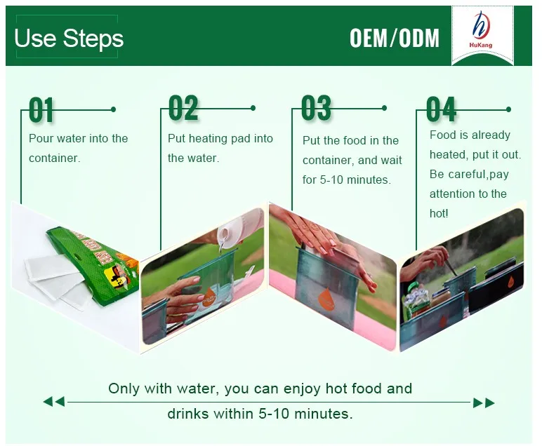 Application | 1.Army to heat Meal Ready-to-eat(MRE) 2.MRE manufactures,food company international,coffee suppliers 3.Outdoor travelers,camping,hiking,fishing,explore or anyone in emergency preparedness 4.Easily in situations where fire is prohibited or not recommended | ||||