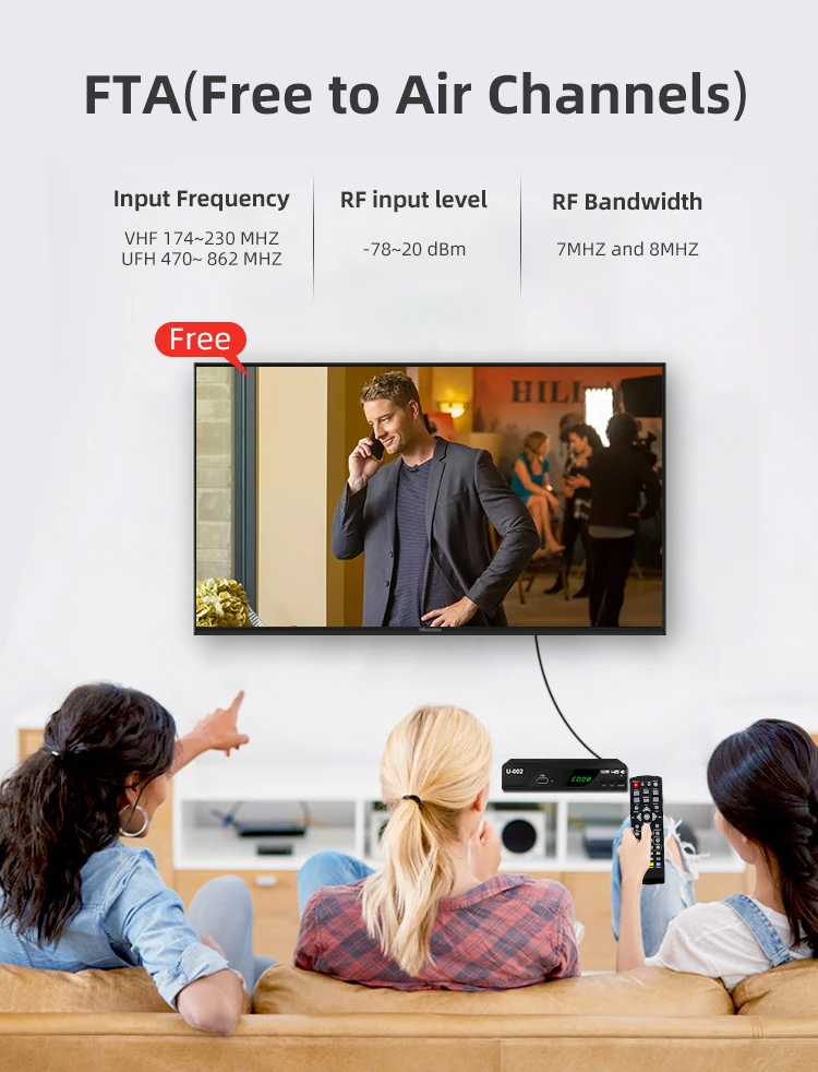 Packing | Packing : 1 Color Box Color box : 185*155*58mm Qty per export carton : 20pcs pieces Meas. per export carton : 39*31*33cm One Color box include: 1* DVB-T2 HD Receiver 1* Remote Controler 1* AV Cable 1* User Manual 2*Batteries(Optional) |