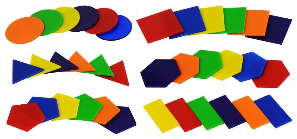 The set consists of squares, rectangles, circles, triangles, hexagons and pentagons.