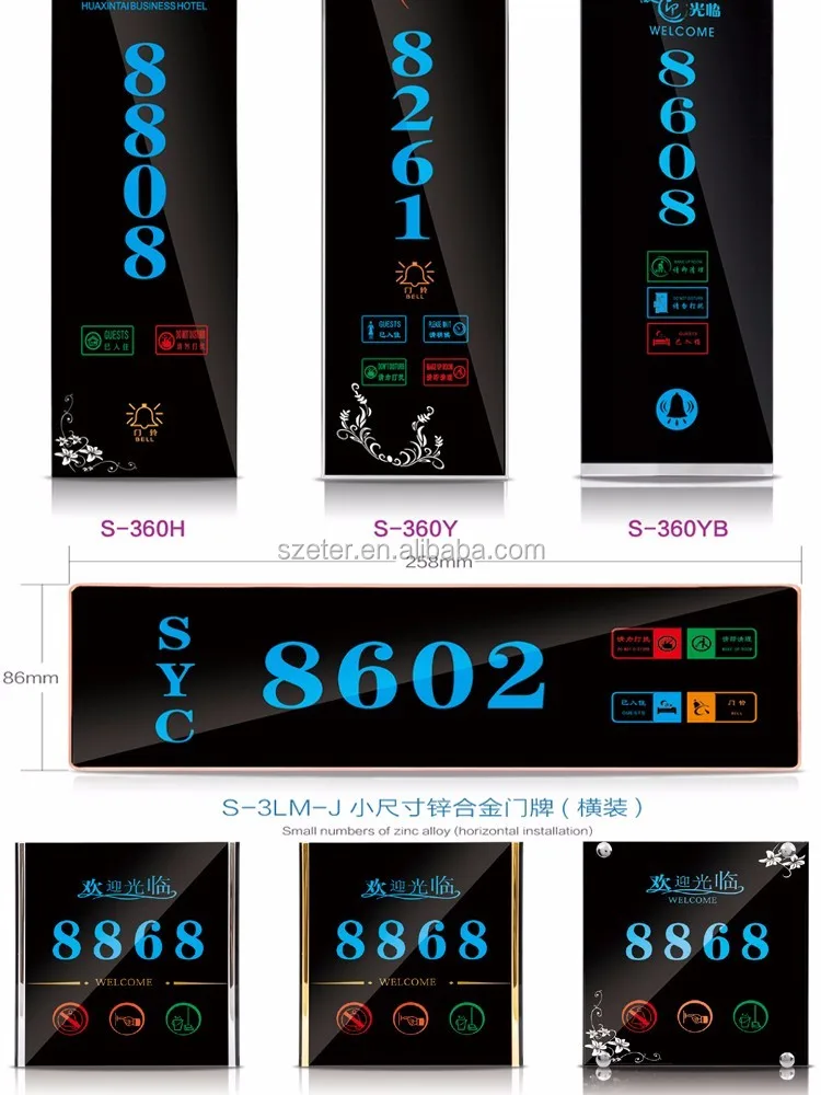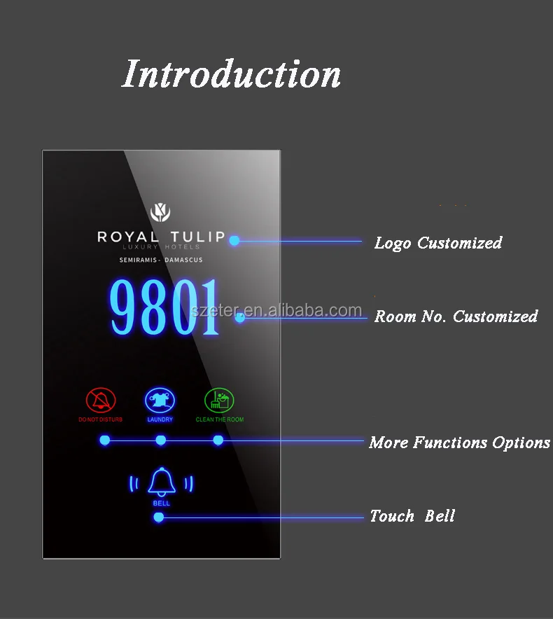1.Showing Room number, 2.Do not disturb; 3.Touch bell 4.Clean (or Make up room)function 5.Hotel name or logo showed as request 6. Customize |