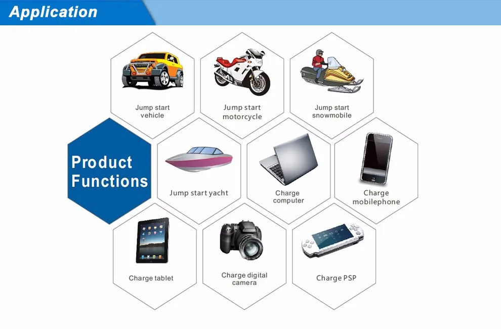 A1: Starting dead 12V/24V vehicle; Starting dead motorcycle, sleigh, yacht. Charging mobile phone, pad,