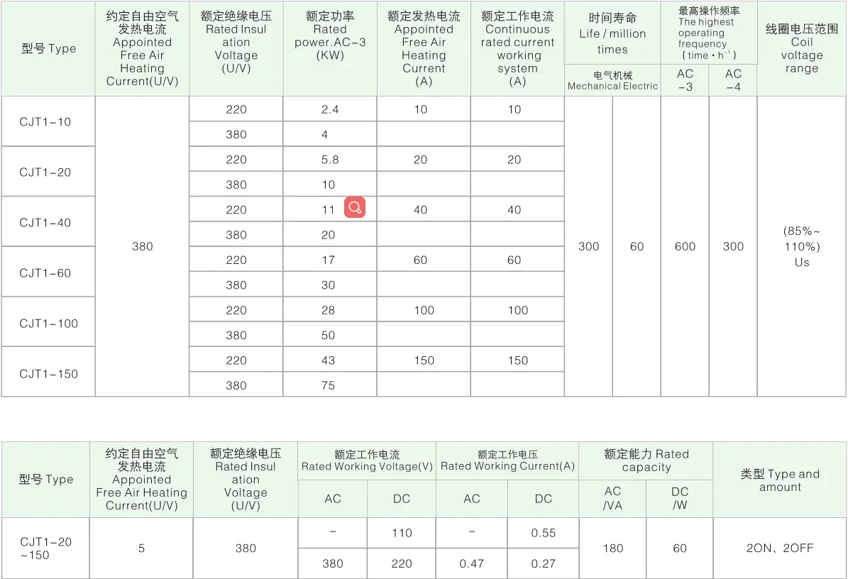 CJT-1 Series AC contactors are suitable for frequency 50 Hz, rated insulation voltage up to 380V, rated operation current 10--150A. It is mainly used for making or breaking electric circuits at a long distance and for frequent starting and stopping and controlling AC motor. It is used in combination with thermal relay to compose a magnetic motor starter. The product accords with such standards as IEC60947-4-1, GB14048.4.