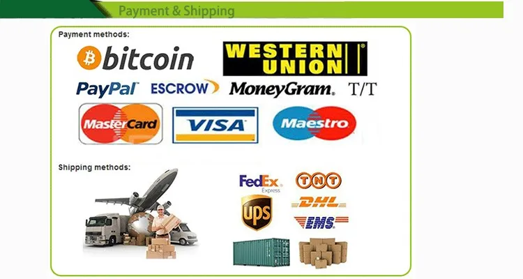A: Proforma invoice will be sent first after confirmation of order, enclosed our bank information.We accept T/T (Telegraphic Transfer),Western Union or Paypal or Escrow(Alibaba).