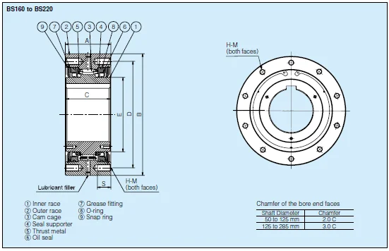 | Model | Torque Capacity (N·m) | Max. Overrunning (r/min) Inner Race | Drag Torque (N·m) | A | B | C | PCD D | E | S | H-M Size× Pitch × No.of Tapped HoleS | Grease Filler Hole (Size) | Q’ty Grease (kg) | Weight (Kg) |