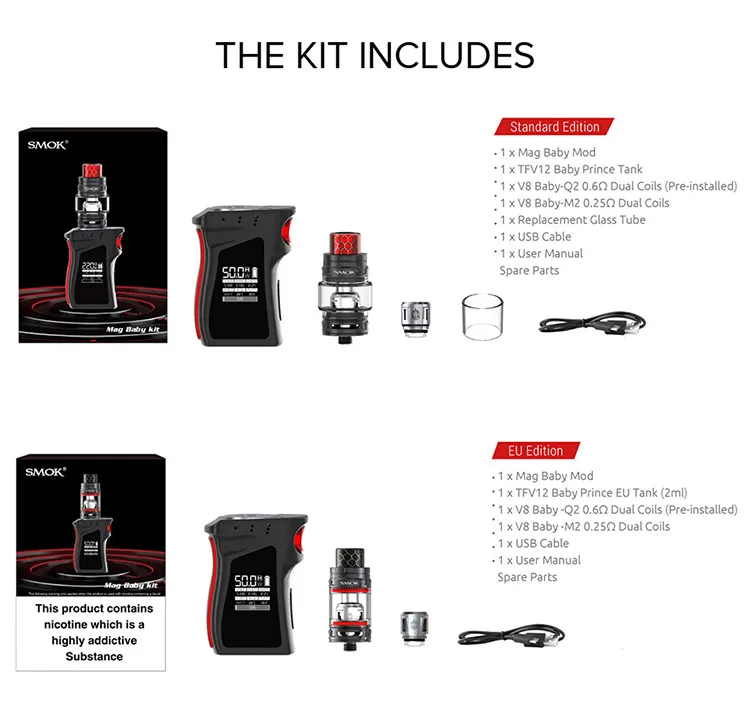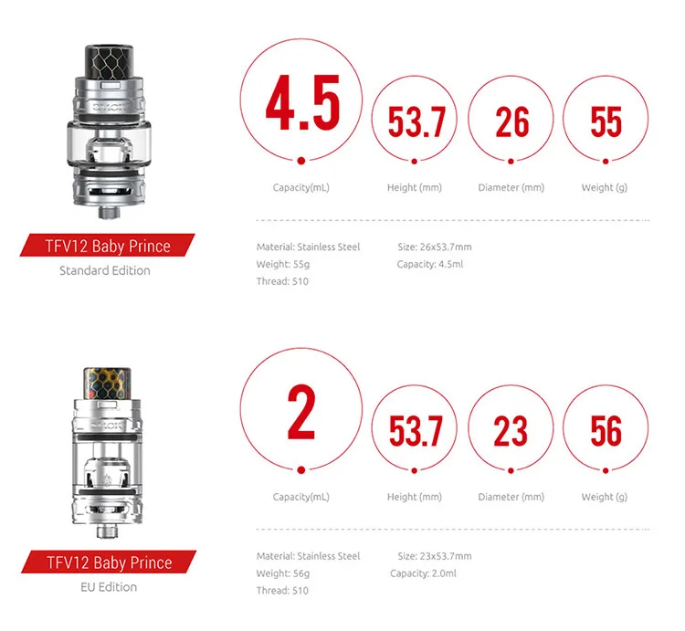 5. Paired with TFV12 Baby Prince Tank, comes with both 4.5ml standard version and 2ml TPD version available to choose