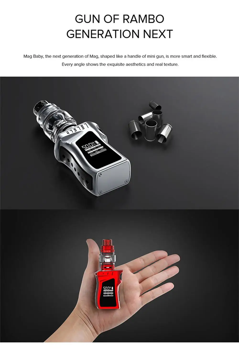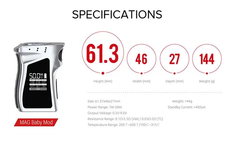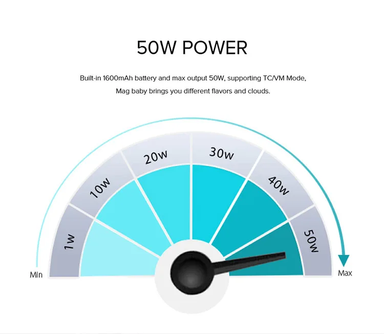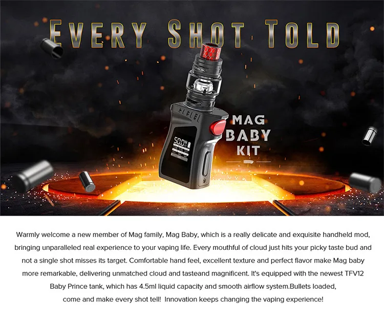 Warmly welcome a new member of Mag family, Mag Baby, which is a really delicate and exquisite handheld mod, bringing unparalleled real experience to your vaping life. Every mouthful of cloud just hits your picky taste bud and not a single shot misses its target. Comfortable hand feel, excellent texture and perfect flavor make Mag baby more remarkable, delivering unmatched cloud and tasteand magnificent. It's equipped with the newest TFV12 Baby Prince tank, which has 4.5ml liquid capacity and smooth airflow system.