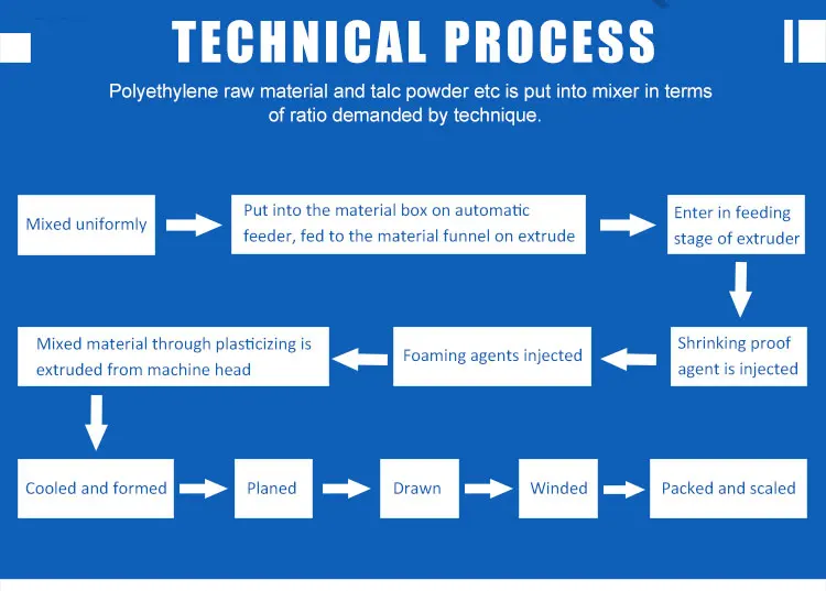 Polyethylene raw material and talc powder etc is put into mixer in terms of ratio demanded by technique. Mixed uniformly—put into the material box on automatic feeder, fed to the material funnel on extruder---enter in feeding stage of extruder---shrinking proof agent is injected---foaming agents injected---mixed material through plasticizing is extruded from machine head.