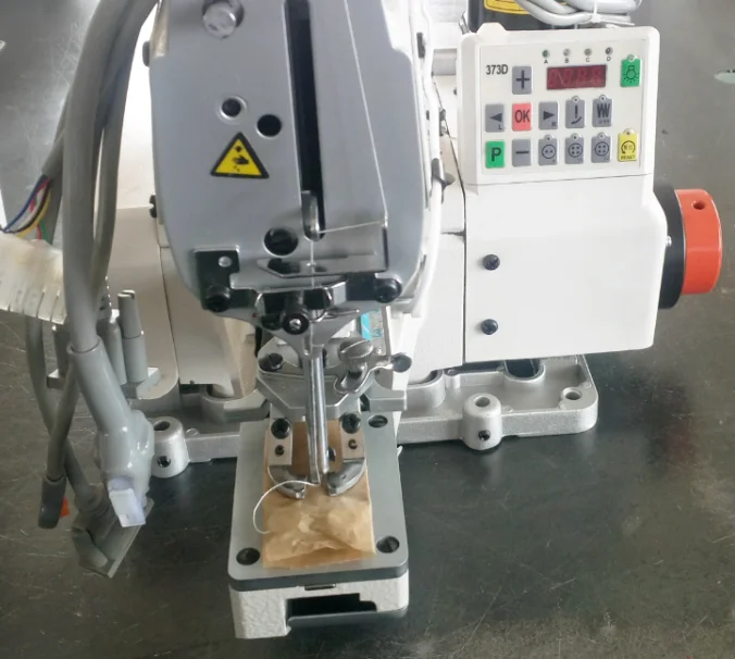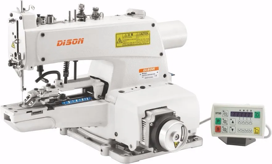 Computerized direct drive high speed button attaching sewing machine.