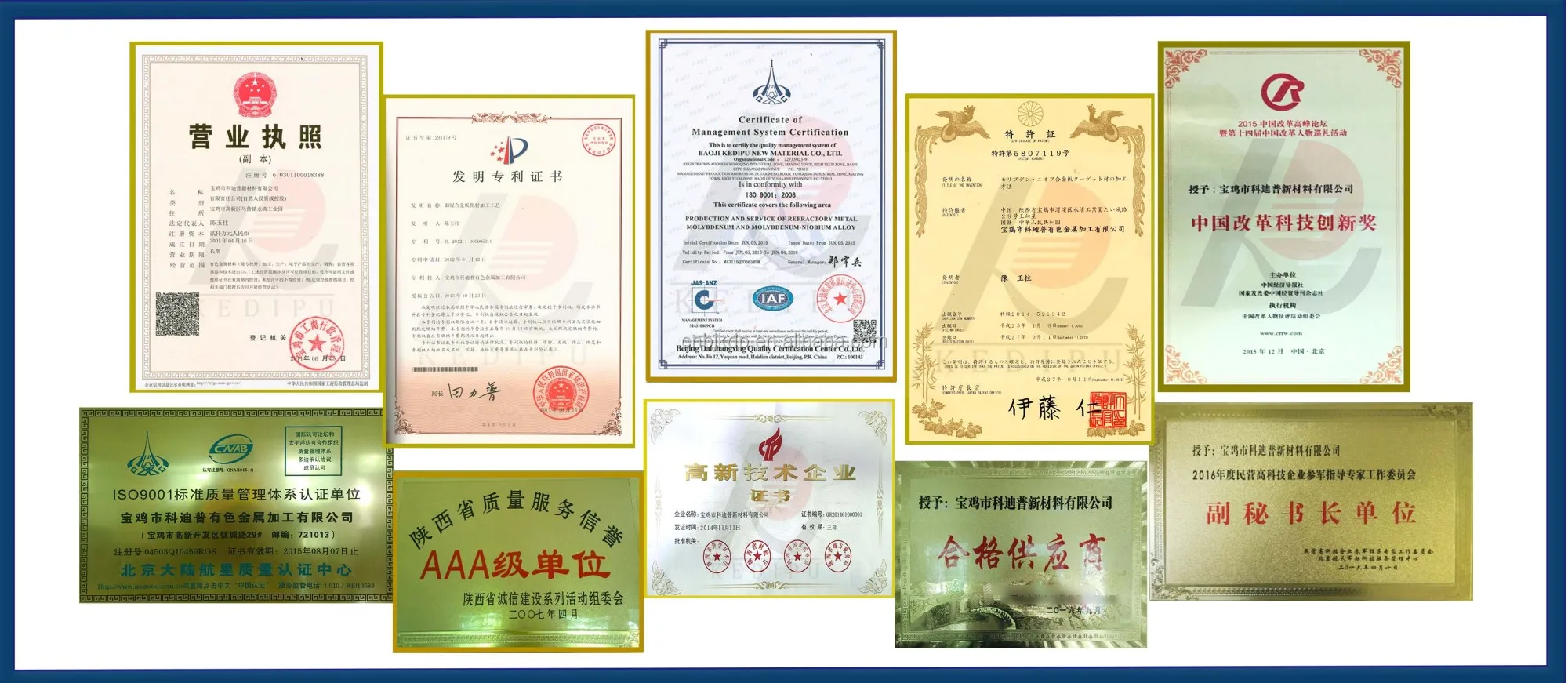 1. We are an ISO9001 certified company. 2. We've been granted the patent in making Molybdenum&Niobium alloy. 3. We've been awarded as a High-Tech Enterprise. 4. We've been invested by the National Fund for High-end Equipment. |