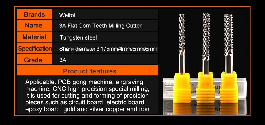 PCB end mill and PCB drill bit series:no coating PCB end mill, TiN coating PCB end mill, PCB end mill without positioning ring, PCB end mill with positioning ring, no coating PCB drill bit, TiN coating PCB drill bit, PCB drill bit without positioning ring, PCB drill bit with positioning ring, corn teeth end mill, etc.