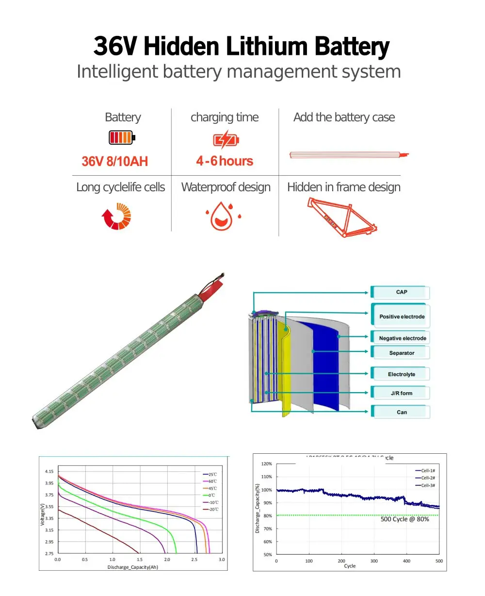 Battery | 36V 8AH/10AH Lithium battery, hidden in the frame | |