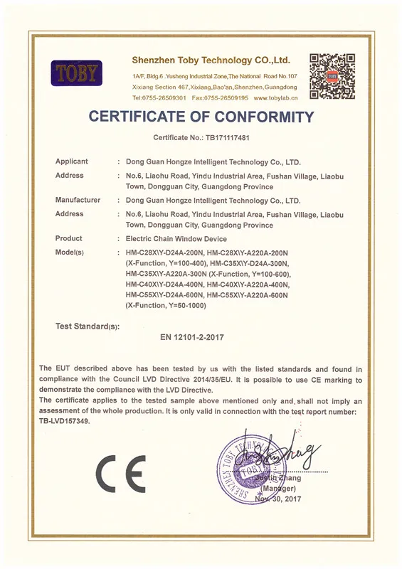 Dongguan Hongze intelligent technology Co.,ltd is located in Guangdong province, which is specialist in researching and manufacturing intelligent ventilation system, smoke exhaust system, electric window, manual window and window louver system.our company has brought in advanced products.technologies and design concepts from Germany, Italy and other European countries, comprehensive inspection of authoritative fire testing center.